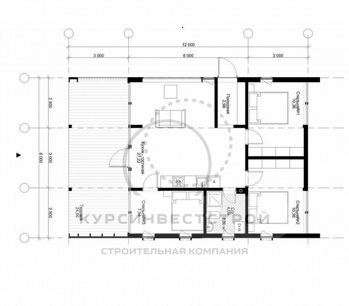 - Габариты 8х9м + терраса 3х8м. (Общая S = 96 кв.м)